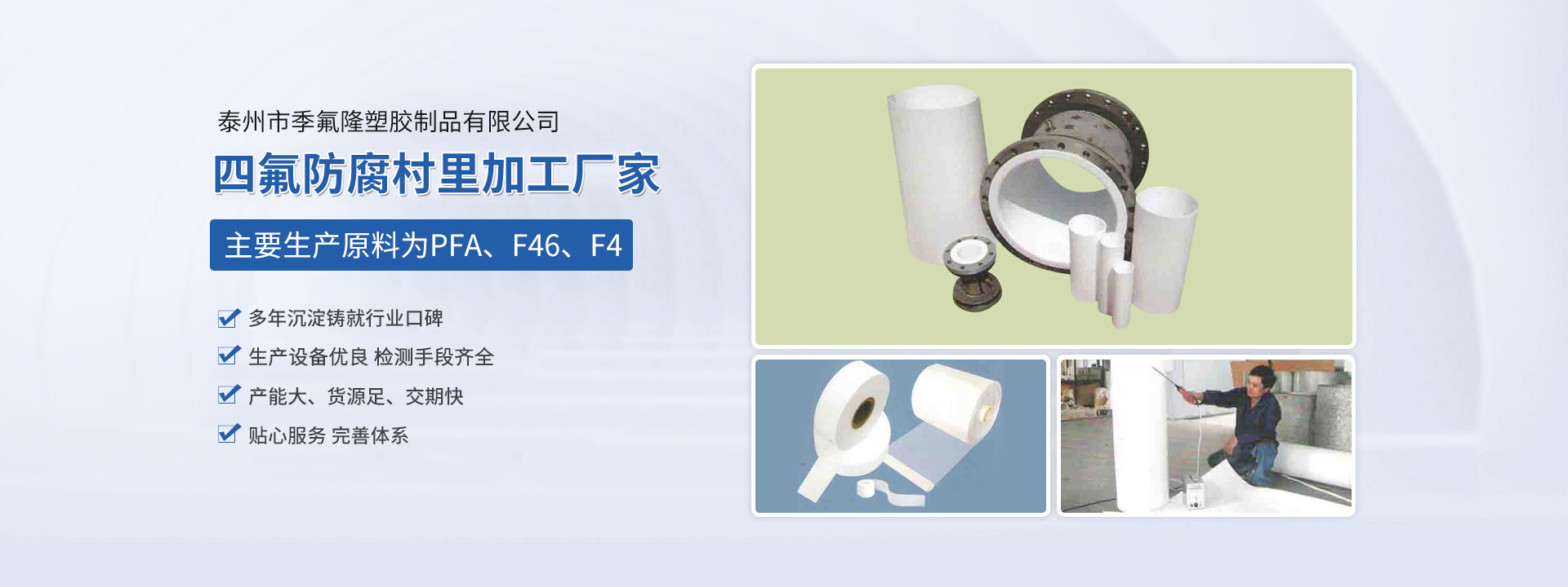 泰州市季氟隆塑膠制品有限公司(江蘇斯瑞沃爾科技發(fā)展有限公司)占地8000平方米,各類專用生產(chǎn)設(shè)備三十多合,現(xiàn)有員工近20人,其中技術(shù)人員10名,均多年從事該行業(yè)生產(chǎn),經(jīng)驗(yàn)豐富。本公司主要生產(chǎn)原料為PFA、F46、F4,主要為電磁傳感器、防腐管道、各種容器反應(yīng)釜三通四通彎頭及各種閥門等產(chǎn)品進(jìn)行防腐村里加工,長期為德國、日本、美國、新加坡等國在華合資公司配套,產(chǎn)品廣泛應(yīng)用于環(huán)保、油田、化工、造紙、冶金等行業(yè),產(chǎn)品質(zhì)量優(yōu)良,服務(wù)及時周到,一直深受顧客信賴。